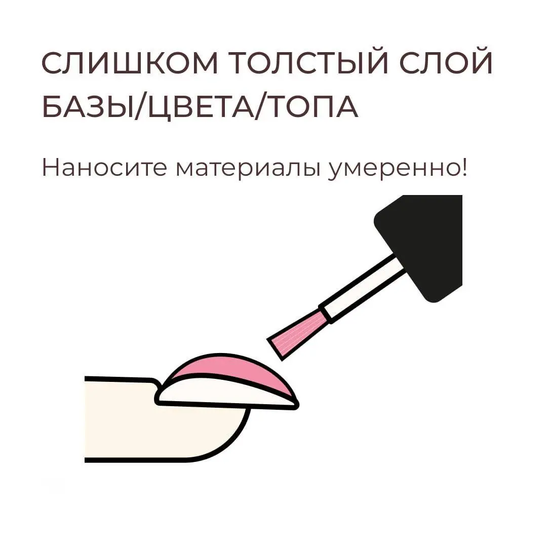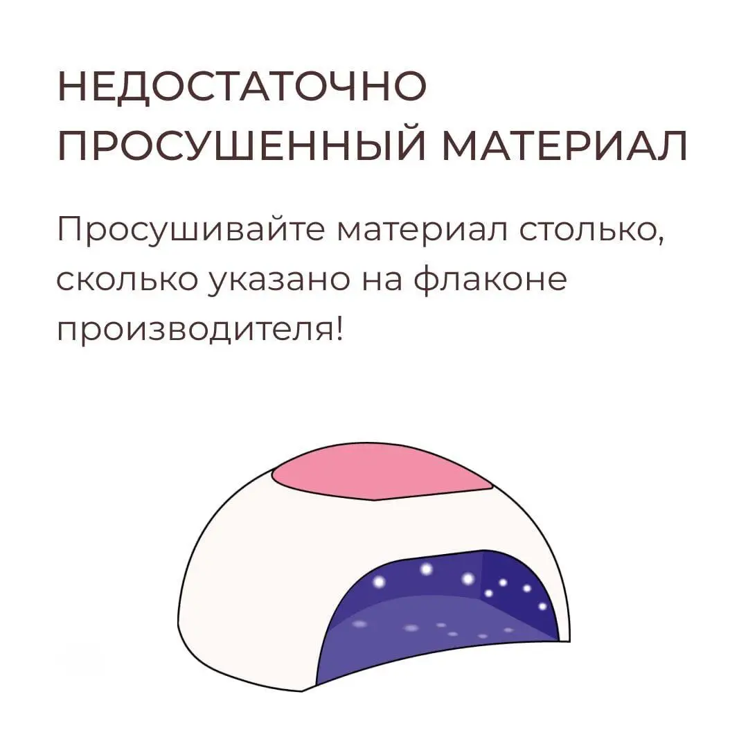 Если база или цвет недосохли, то внутри остаётся «сырая» часть. При носке она двигается, тянется и образует трещины или пузыри. Производитель всегда пишет время — это не рекомендация, а правило. У разных ламп — разная мощность и сушат они по-разному.