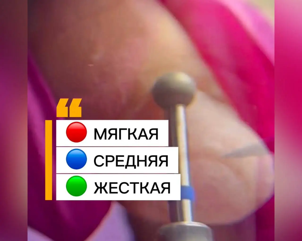 Также важен правильный подбор фрезы в зависимости от типа кожи: мягкая (красная), средняя (синяя), жесткая (зелёная).