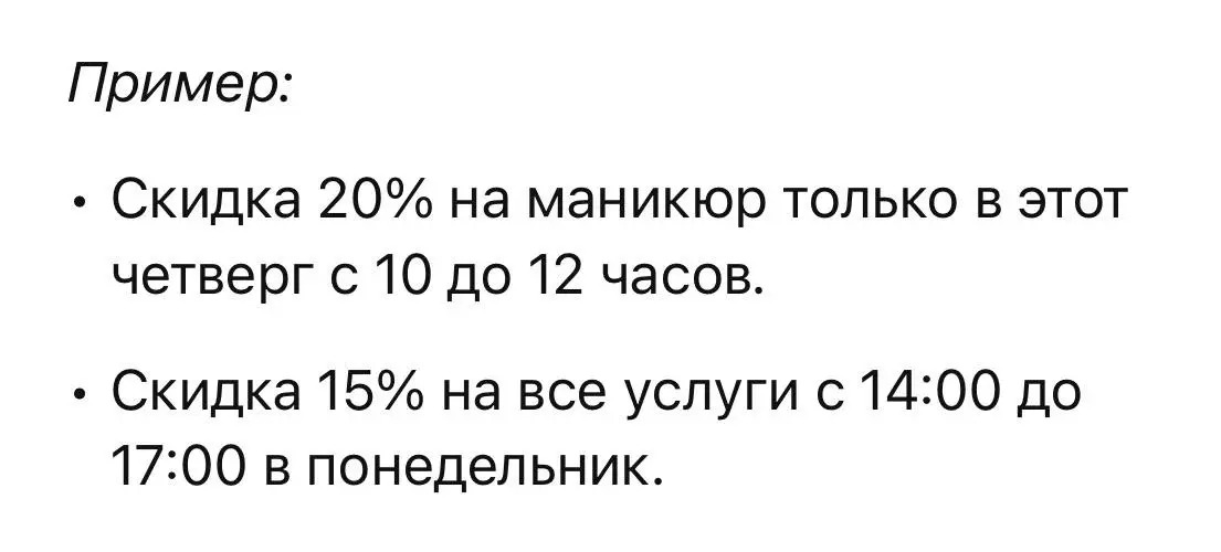 Как только у вас есть свободные окна в расписании, выделите день (или даже часы) с «счастливой скидкой». Укажите, что этот день — уникальный шанс сделать процедуру по сниженной цене.