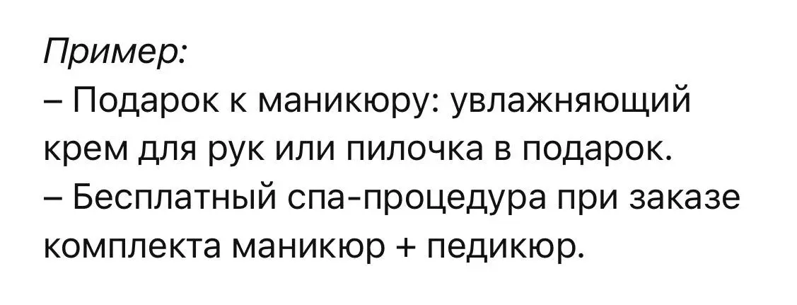 Например, подарок в виде мини-ухода для рук или небольшой косметики. Подарок воспринимается как бонус, а не как экономия, и это более ценно в глазах клиента.