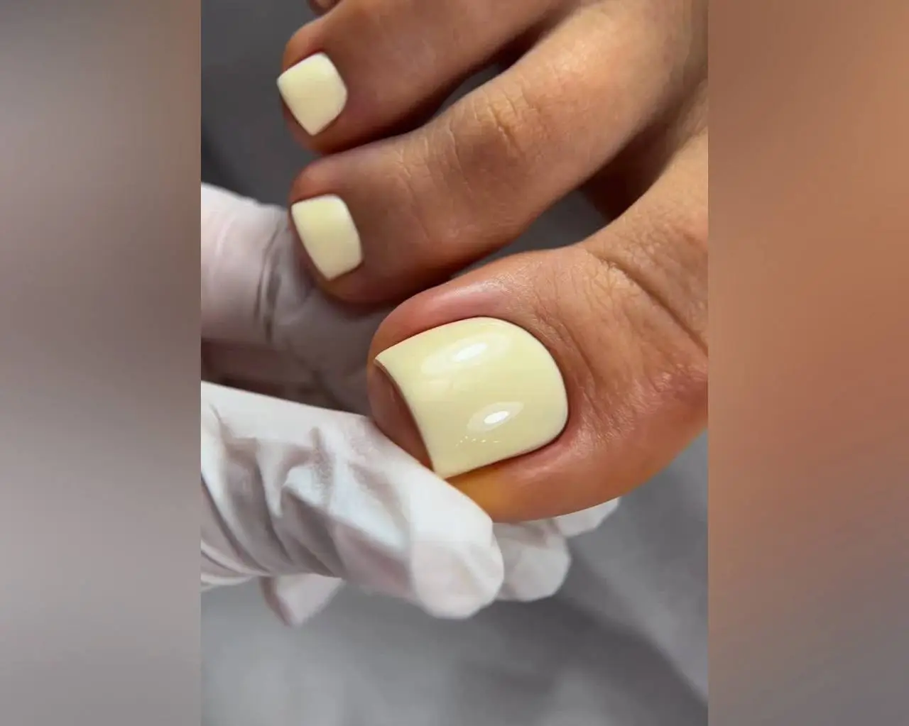 Для этого педикюра выбирайте сливочный или персиково-сливочный оттенок, который будет прекрасно смотреться как в классическом исполнении, так и с добавлением небольших акцентов — например, тонкие золотые линии или нежные цветочные рисунки.
