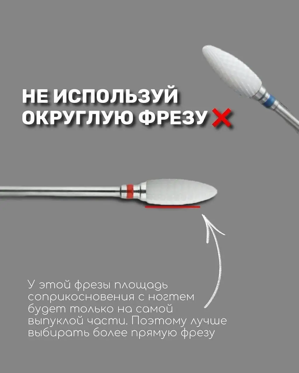 НЕ ИСПОЛЬЗУЙ ОКРУГЛУЮ ФРЕЗУ для основного снятия. У такой фрезы площадь соприкосновения с ногтем есть только на самой выпуклой части. Из-за этого: