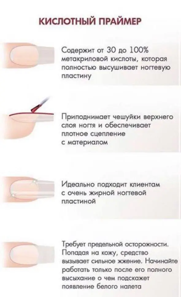 Кислотный праймер содержит метакриловую кислоту, которая обеспечивает максимально прочную фиксацию, но требует аккуратности, так как при попадании на кожу вызывает жжение.