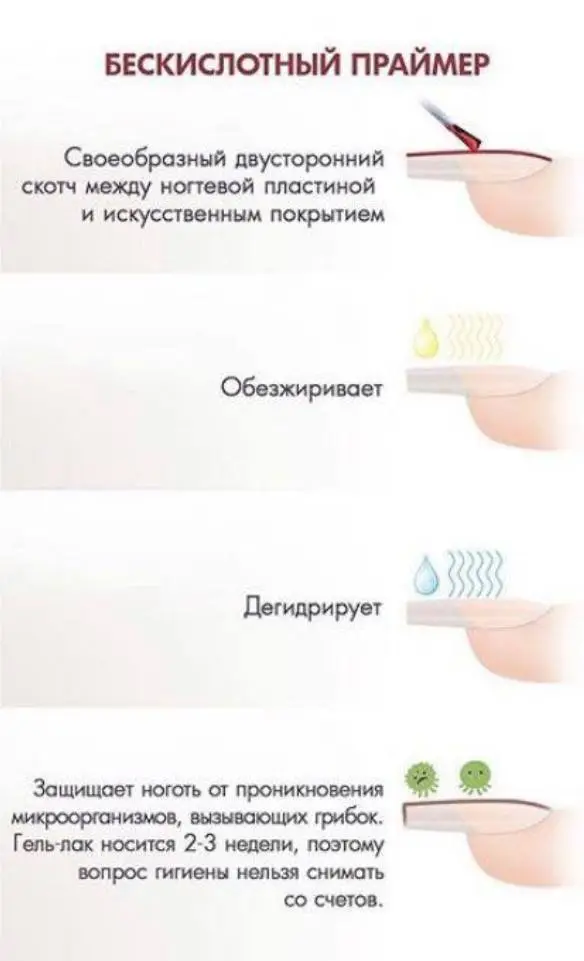 Бескислотный праймер действует мягче: он не травмирует ноготь, но создаёт прочную сцепку и защищает от микробов.