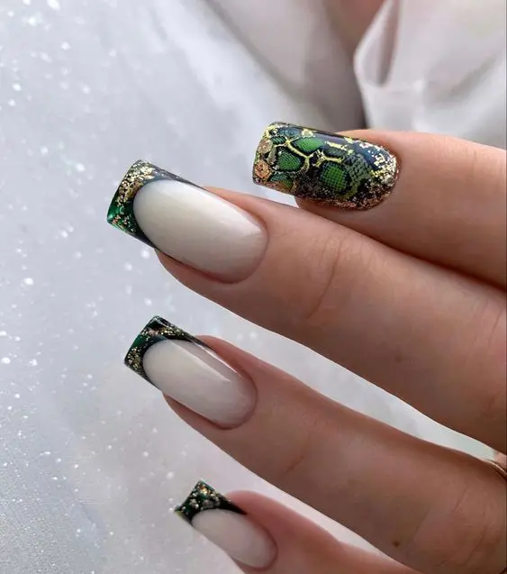 Попробуйте сделать френч с змеиной отделкой — например, добавив змеиный узор только на кончики ногтей.