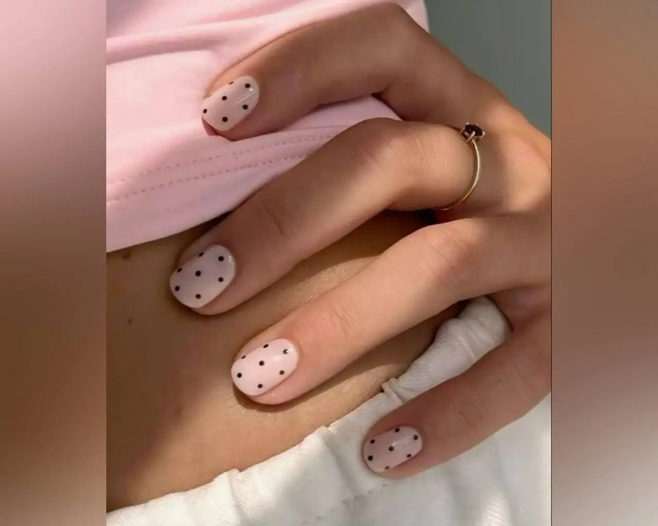 Если вам нравится минимализм, выбирайте пастельные тона: нежный розовый, мятный, бежевый или светло-серый — и наносите небольшие точки на один-два пальца. Для такого маникюра идеально подойдут мелкие точки, аккуратно размещенные по одному или нескольким ногтям.