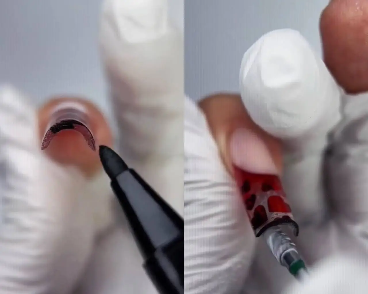 Мастер маникюра Регина Дадабаева делится эффективным лайфхаком: чтобы исправить неровности торца, нужно просто закрасить его чёрным маркером.